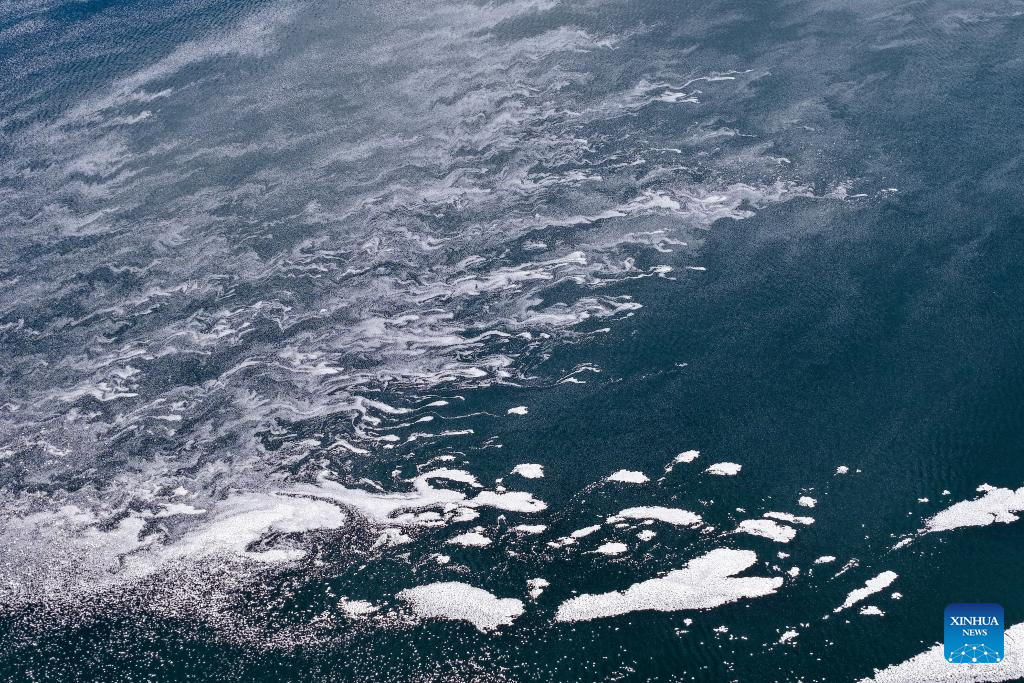Una foto aérea tomada con un dron el 16 de noviembre de 2025 muestra la superficie helada del lago Dasugan, en el distrito autónomo de la etnia kazaja de Aksay, Jiuquan, provincia de Gansu. (Xinhua/Lang Bingbing).
