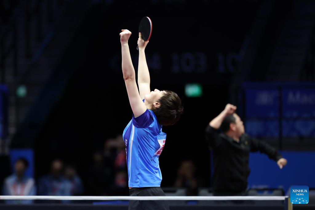 Wang Manyu reacciona tras la final femenina individual de tenis de mesa entre Sun Yingsha, de Hebei, y Wang Manyu, de Heilongjiang, en los XV Juegos Nacionales de China, celebrados en Macao, el 16 de noviembre de 2025. (Xinhua/Liu Xu)