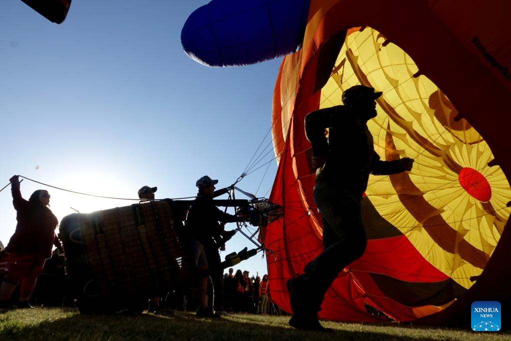 Personas preparan un globo aerostático previo a elevarse durante el Festival Internacional del Globo 2025, en León, en el estado de Guanajuato, México, el 15 de noviembre de 2025. (Xinhua/Carolina Endara)