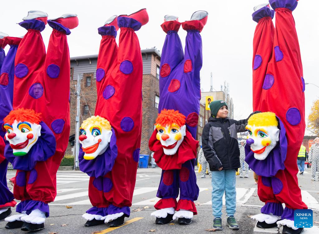 Imagen del 23 de noviembre de 2025 de un niño posando para fotografías junto a participantes disfrazados durante el Desfile Original de Santa Claus 2025, en Toronto, Canadá. El desfile anual, en el que participaron docenas de carrozas temáticas y bandas de música, se celebró aquí el domingo. (Xinhua/Zou Zheng)