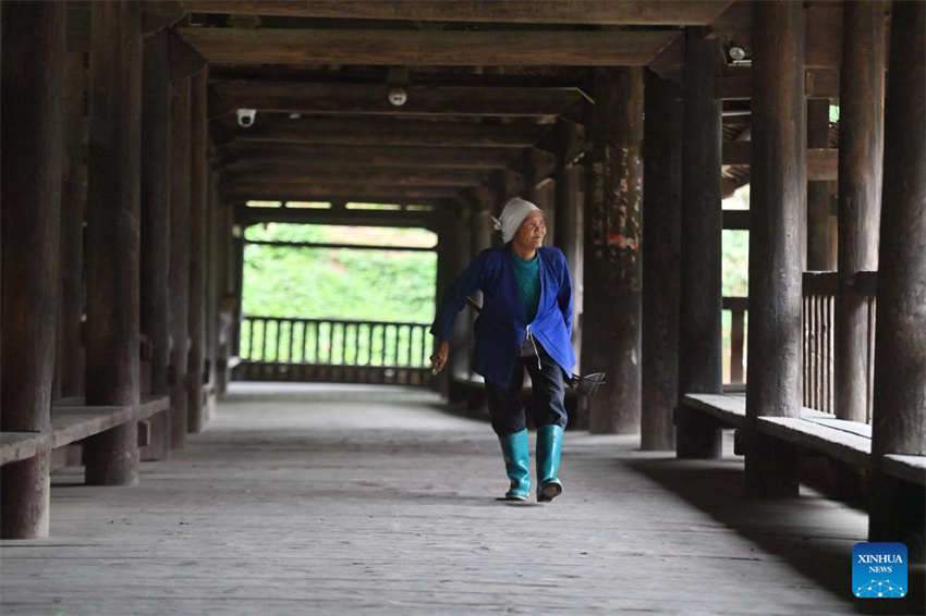 Una anciana pasa frente a un puente de madera en la aldea de Batuan, en el distrito autónomo de la etnia dong de Sanjiang, en la región autónoma de la etnia zhuang de Guangxi, el 5 de noviembre de 2025. (Xinhua/Huang Xiaobang).