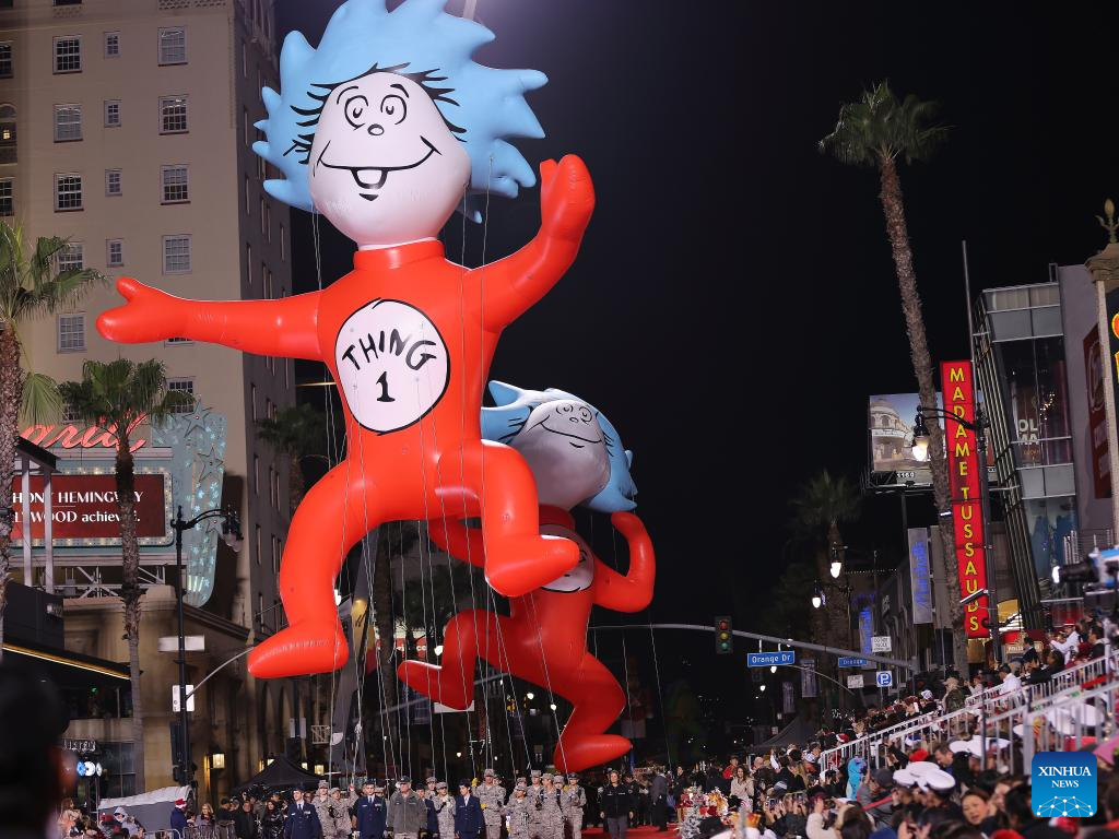 Imagen del 30 de noviembre de 2025 de globos gigantes vistos durante el 93° Desfile Anual Navideño de Hollywood, en Los Angeles, California, Estados Unidos. (Xinhua/Qiu Chen)