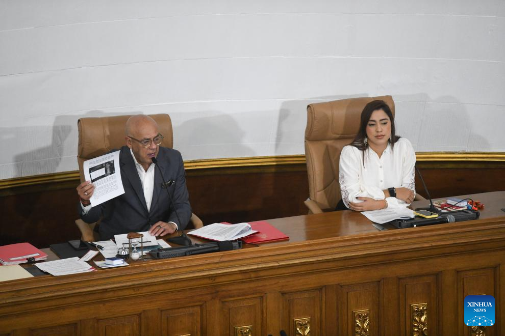 El presidente de la Asamblea Nacional (AN) de Venezuela, Jorge Rodríguez (i), habla durante una sesión extraordinaria de la AN, en el Palacio Federal Legislativo, en Caracas, Venezuela, el 2 de diciembre de 2025. La AN de Venezuela repudió el martes, por unanimidad, el despojo de la petrolera venezolana CITGO y criticó a sectores de la oposición, tras la decisión de la justicia estadounidense de vender la empresa. (Xinhua/Marcos Salgado)