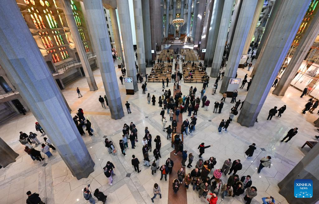 Imagen del 1 de diciembre de 2025 de turistas visitando la basílica de la Sagrada Familia, en Barcelona, España. La basílica de la Sagrada Familia, obra maestra del diseñador de renombre mundial, Antoni Gaudí, sigue en construcción desde que se colocó la primera piedra en 1882. (Xinhua/Cheng Min)