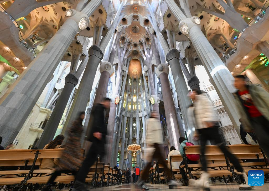 Imagen del 1 de diciembre de 2025 de turistas visitando la basílica de la Sagrada Familia, en Barcelona, España. La basílica de la Sagrada Familia, obra maestra del diseñador de renombre mundial, Antoni Gaudí, sigue en construcción desde que se colocó la primera piedra en 1882. (Xinhua/Cheng Min)