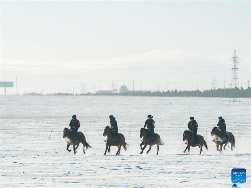 Policías del equipo de policía montada "Gerifalte" realizan actividades de entrenamiento en la pradera nevada de la bandera de Chenbarhu, en Hulun Buir, región autónoma de Mongolia Interior, en el norte de China, el 2 de diciembre de 2025. (Xinhua/Darhan).