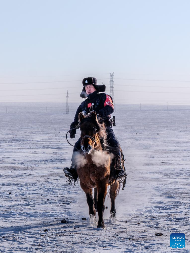El equipo de policía montada "Gerifalte" custodia las praderas en la frontera norte de China