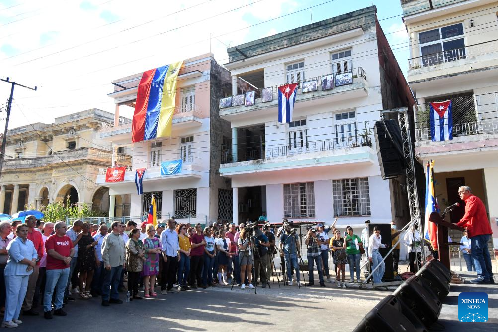 Imagen del 6 de diciembre de 2025 de Orlando Maneiro (d), embajador venezolano en Cuba, pronunciando un discurso durante una concentración realizada en el contexto de la jornada mundial de solidaridad con Venezuela frente a la sede del Instituto Cubano de Amistad con los Pueblos, en La Habana, capital de Cuba. Cientos de cubanos ratificaron el sábado durante una movilización en La Habana su solidaridad con Venezuela ante las agresiones de Estados Unidos contra la nación sudamericana. (Xinhua/Joaquín Hernández)
