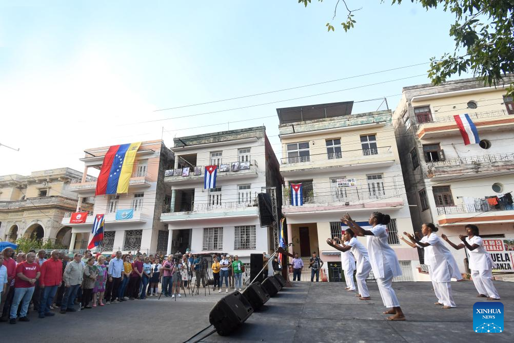 Imagen del 6 de diciembre de 2025 del ministro de Relaciones Exteriores de Cuba, Bruno Rodríguez (4-i-frente), observando una presentación cultural durante una concentración realizada en el contexto de la jornada mundial de solidaridad con Venezuela frente a la sede del Instituto Cubano de Amistad con los Pueblos, en La Habana, capital de Cuba. Cientos de cubanos ratificaron el sábado durante una movilización en La Habana su solidaridad con Venezuela ante las agresiones de Estados Unidos contra la nación sudamericana. (Xinhua/Joaquín Hernández)