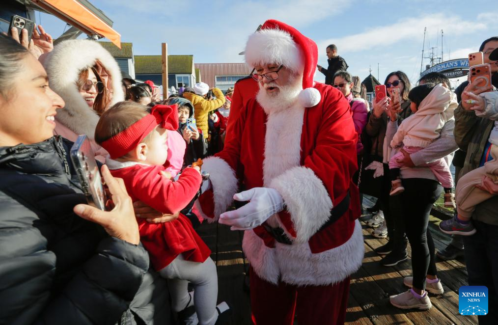 Imagen del 7 de diciembre de 2025 de un hombre disfrazado de Santa Claus interactuando con un bebé en Fisherman's Wharf, en la aldea Steveston, Richmond, Columbia Británica, Canadá. El evento de llegada de Santa Claus se celebró aquí el domingo, marcando el inicio de las celebraciones navideñas locales y atrayendo a cientos de residentes para asistir. (Xinhua/Liang Sen)