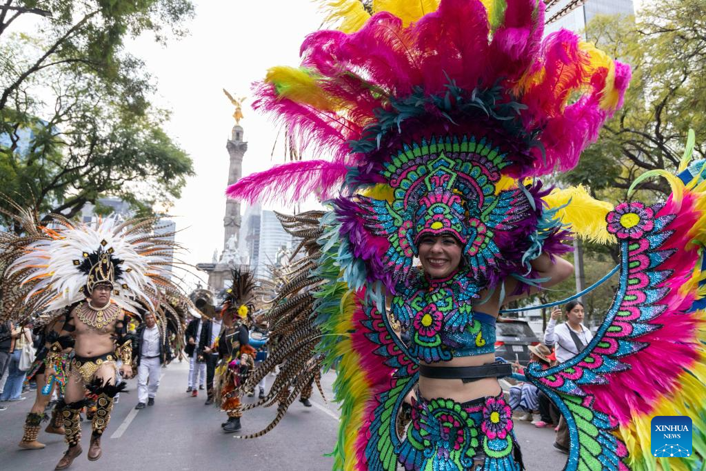 Artistas desfilan con trajes típicos durante el Carnaval Villa-Zapata en la Ciudad de México, el 6 de diciembre de 2025. (Xinhua/Li Mengxin).