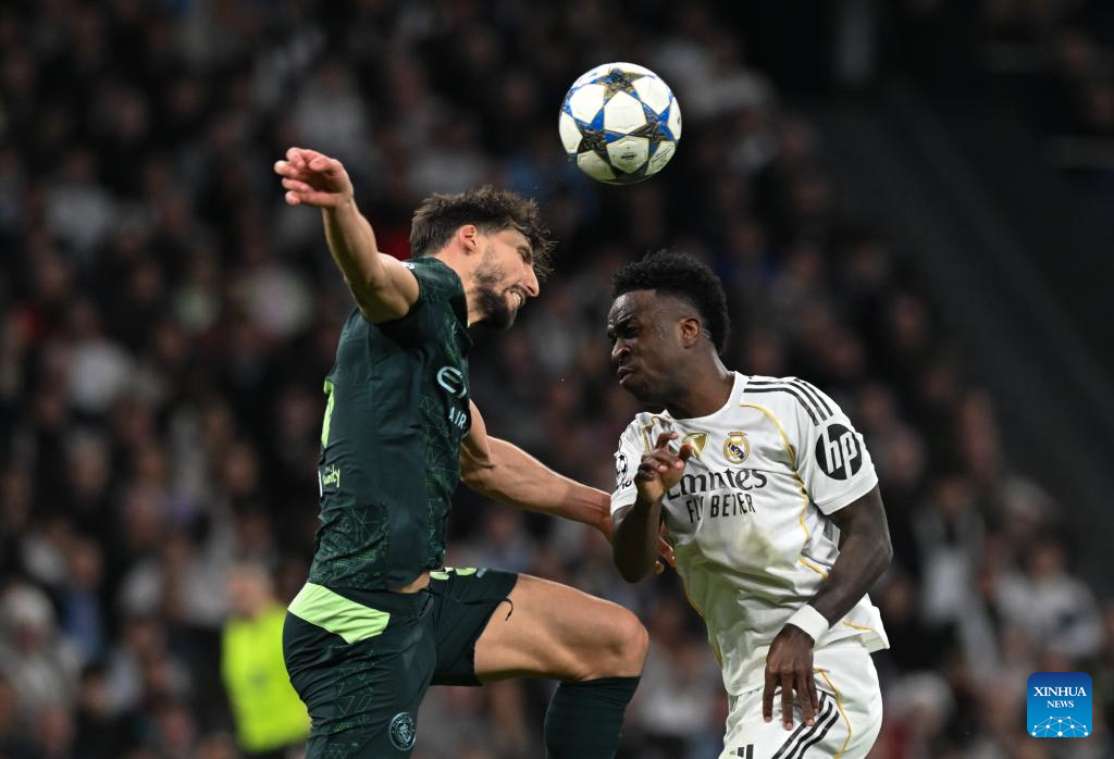 Imagen del 10 de diciembre de 2025 de Vinicius Junior (d), de Real Madrid, cabeceando el balón durante el partido de fútbol de la Liga de Campeones de la UEFA, entre Real Madrid y Manchester City, en Madrid, España. (Xinhua/Cheng Min)