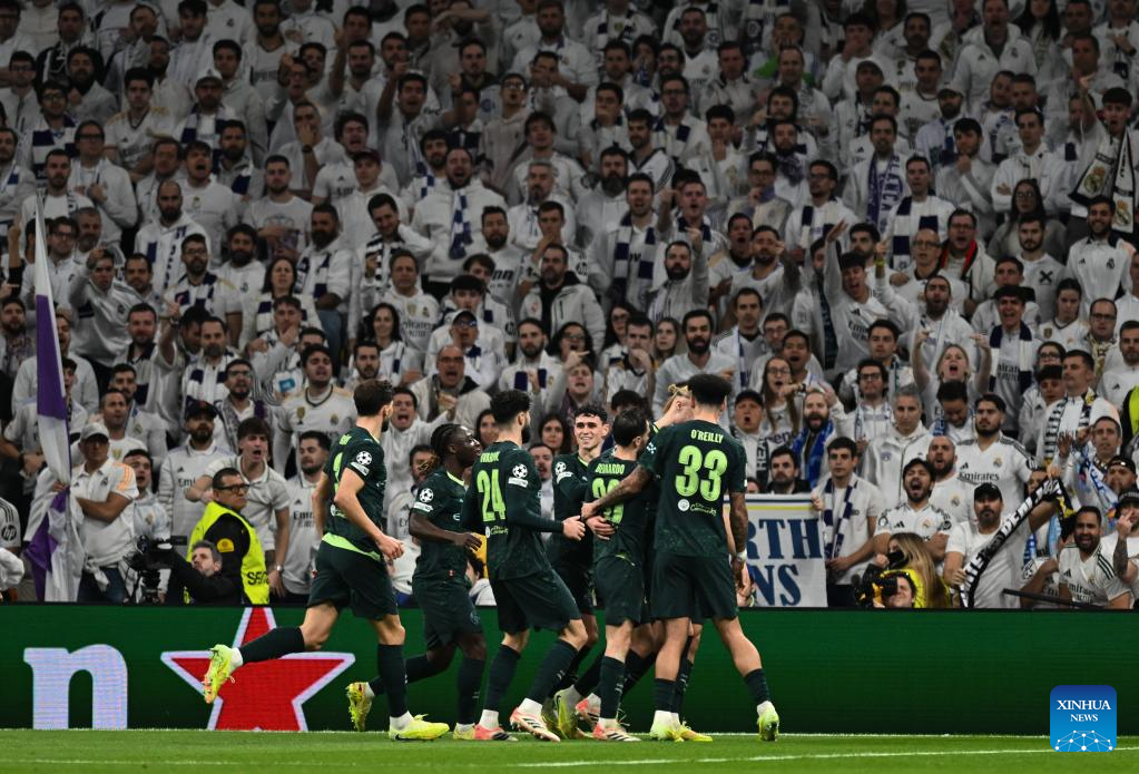 Imagen del 10 de diciembre de 2025 de jugadores de Manchester City festejando una anotación durante el partido de fútbol de la Liga de Campeones de la UEFA, entre Real Madrid y Manchester City, en Madrid, España. (Xinhua/Cheng Min)