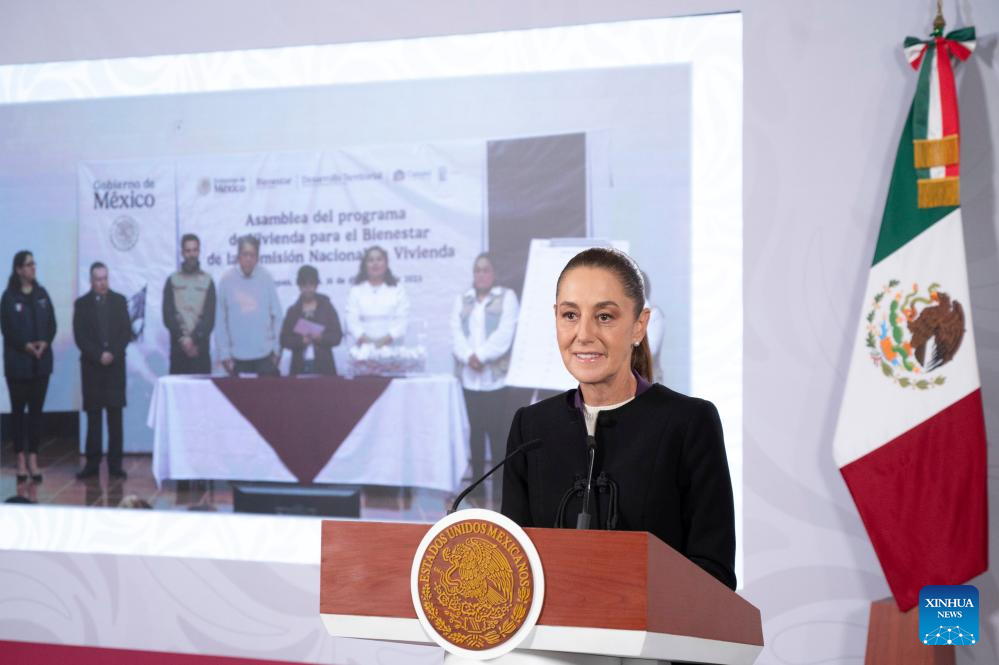 Imagen proveída por la Presidencia de México de la presidenta mexicana, Claudia Sheinbaum, hablando durante su conferencia de prensa matutina, en Palacio Nacional, en la Ciudad de México, capital de México, el 16 de diciembre de 2025. Sheinbaum expresó el martes su desacuerdo con la reciente decisión de su homólogo de Estados Unidos, Donald Trump, de clasificar al fentanilo como "arma de destrucción masiva", al considerar que la medida no ataca las causas de fondo del consumo de drogas ni resolverá la crisis de salud asociada a esta sustancia. (Xinhua/Presidencia de México)
