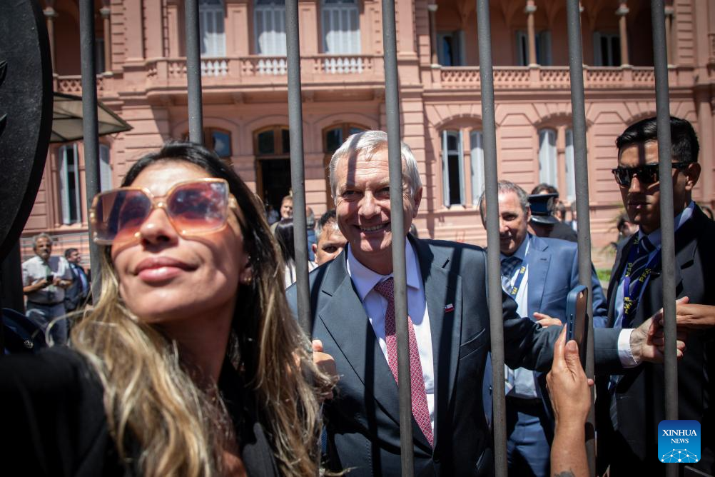 El presidente electo chileno, José Antonio Kast (2-i), se toma una fotografía con una mujer al salir de la Casa Rosada luego de mantener un encuentro con el presidente argentino, Javier Milei, en la ciudad de Buenos Aires, capital de Argentina, el 16 de diciembre de 2025. Milei recibió el martes en Buenos Aires a Kast, a quien felicitó "por el contundente triunfo en la segunda vuelta electoral" realizada el pasado domingo en Chile y le deseó "el mayor de los éxitos en su gestión". (Xinhua/Martín Zabala)