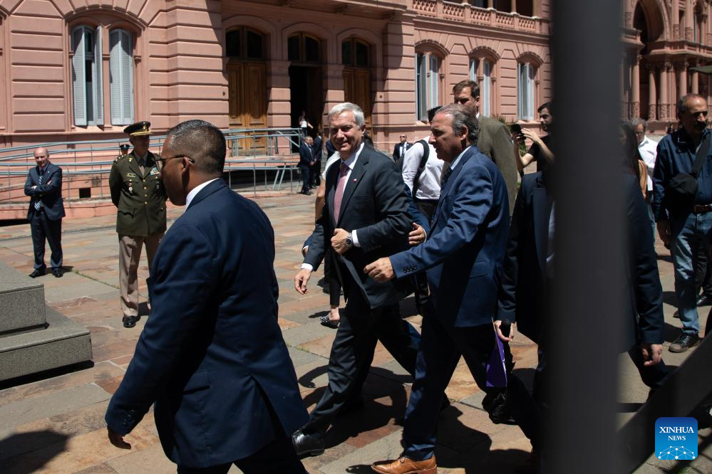 El presidente electo chileno, José Antonio Kast (c), reacciona al salir de la Casa Rosada luego de mantener un encuentro con el presidente argentino, Javier Milei, en la ciudad de Buenos Aires, capital de Argentina, el 16 de diciembre de 2025. Milei recibió el martes en Buenos Aires a Kast, a quien felicitó "por el contundente triunfo en la segunda vuelta electoral" realizada el pasado domingo en Chile y le deseó "el mayor de los éxitos en su gestión". (Xinhua/Martín Zabala)