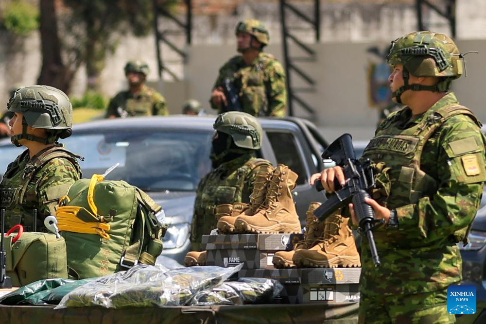 Miembros del Ejército ecuatoriano montan guardia junto a equipo militar durante la ceremonia de entrega de nuevo equipamiento a las Fuerzas Armadas llevada a cabo en el Fuerte Militar Eplicachima, en Quito, capital de Ecuador, el 16 de diciembre de 2025. El presidente de Ecuador, Daniel Noboa, entregó el martes nuevo equipamiento a las Fuerzas Armadas para fortalecer su capacidad logística y operativa en la lucha contra el "narcoterrorismo", que afecta al país sudamericano. (Xinhua/Ricardo Landeta)