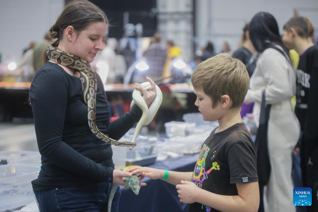 Un niño toca un reptil en la Exposición de Mascotas 2025 en San Petersburgo, Rusia, el 14 de diciembre de 2025. (Foto de Irina Motina/Xinhua).