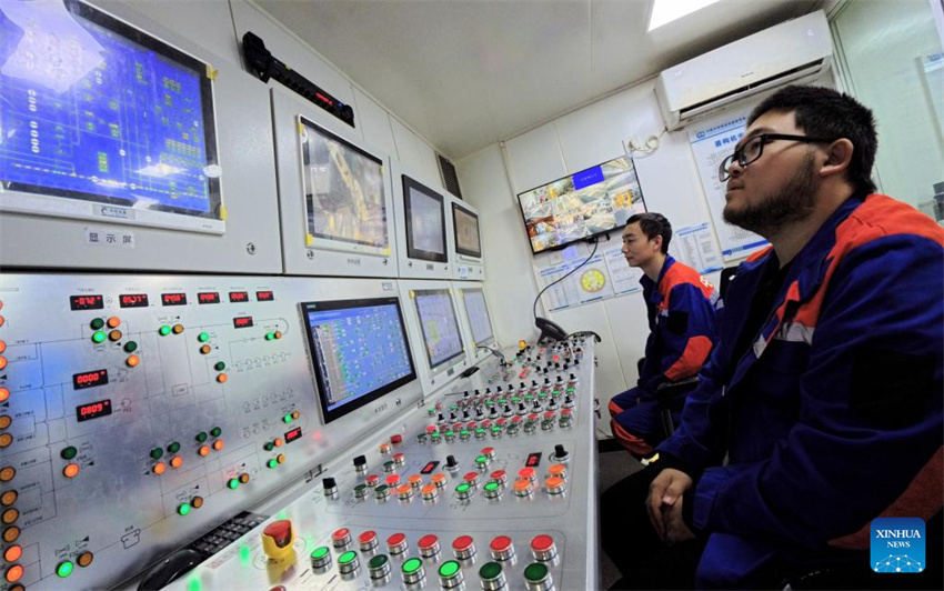 Dos trabajadores supervisan los datos de la operación de perforación del túnel en la sala de control de la tuneladora de escudo de gran diámetro "Linghang" en la obra de construcción del túnel Chongming-Taicang, parte de la línea ferroviaria de alta velocidad Shanghai-Chongqing-Chengdu, el 16 de diciembre de 2025. (Xinhua/Fang Zhe).