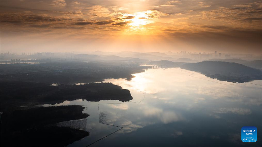 Una foto aérea tomada con dron el 16 de diciembre de 2025 muestra el paisaje en el área del Lago Donghu en Wuhan, provincia de Hubei, en el centro de China. (Xinhua/Xiao Yijiu).