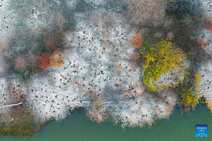 Una foto aérea tomada con dron el 16 de diciembre de 2025 muestra aves descansando en los árboles en el área del lago Donghu en Wuhan, provincia de Hubei, en el centro de China. (Xinhua/Xiao Yijiu).