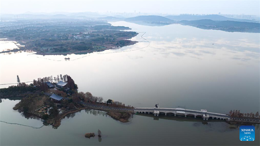 Una foto aérea tomada con dron el 16 de diciembre de 2025 muestra el paisaje en el área del lago Donghu en Wuhan, provincia de Hubei, en el centro de China. (Xinhua/Xiao Yijiu).