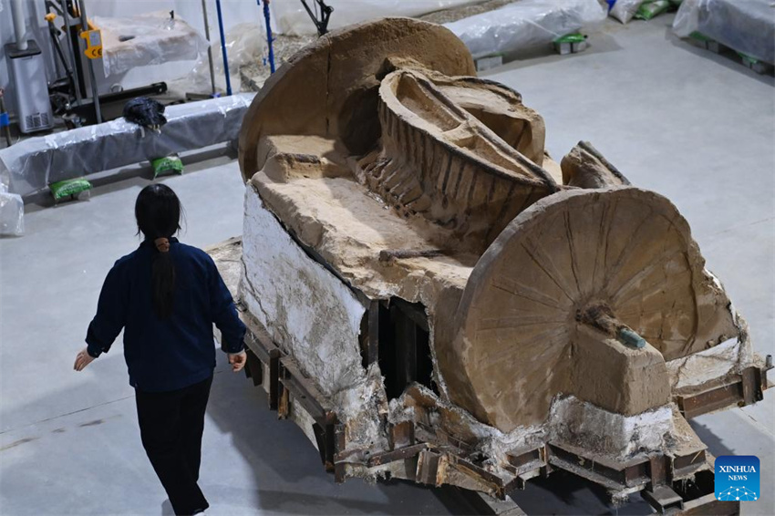 Un carruaje de doble eje desenterrado en el yacimiento Zhaigou se exhibe en un laboratorio de la Academia de Arqueología de Shaanxi en Xi'an, provincia de Shaanxi, noroeste de China, el 12 de diciembre de 2025. (Xinhua/Li Yibo).
