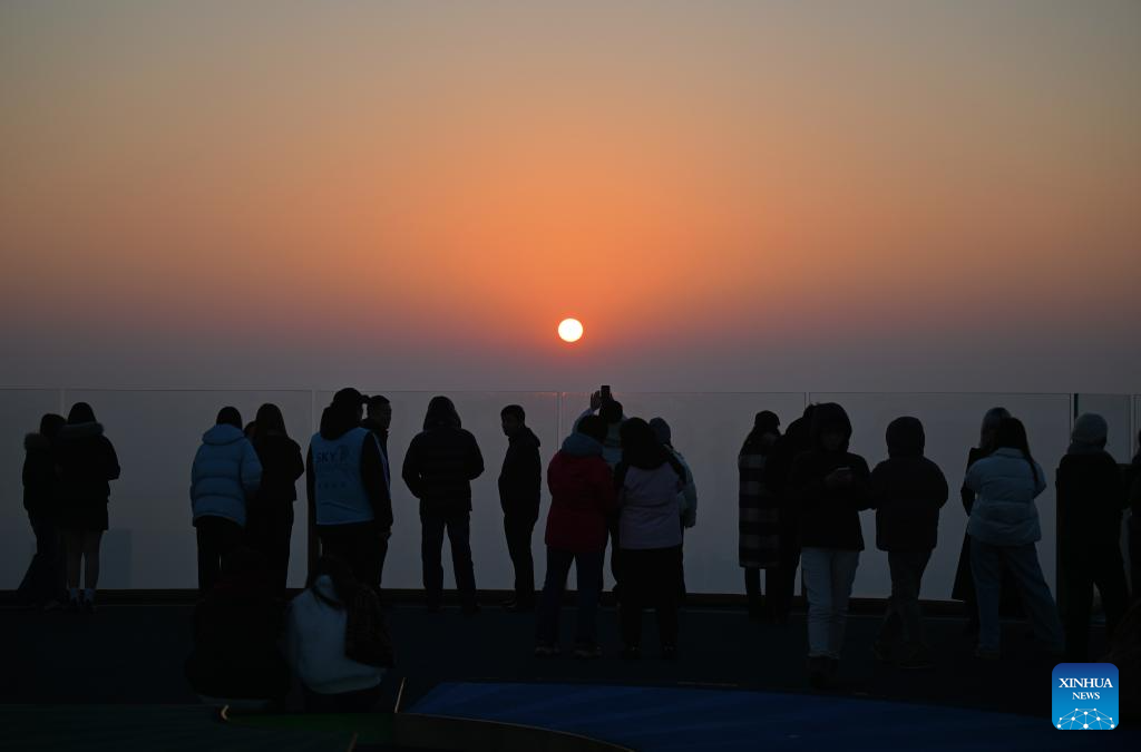 Imagen del 17 de diciembre de 2025 de visitantes observando el atardecer en la plataforma de observación Jinwan Yunding, en el distrito Heping de Tianjin, en el norte de China. Recientemente, la plataforma de observación Jinwan Yunding, situada en la plaza Jinwan, en el distrito Heping de Tianjin, ha comenzado a funcionar. Los visitantes pueden subir a la azotea, a 300 metros de altura, para contemplar la vista urbana de Tianjin. (Xinhua/Li Ran)