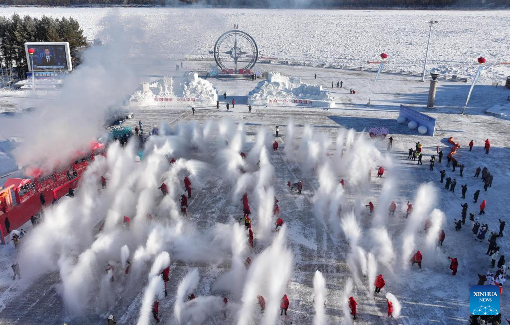 Vista aérea tomada con un dron el 21 de diciembre de 2025 de una presentación "agua a hielo" en un festival cultural con motivo del Solsticio de Invierno, en la aldea de Beiji de la ciudad de Mohe, en la provincia de Heilongjiang, en el noreste de China. Personas asistieron el domingo a un festival cultural que conmemora el solsticio de invierno, el día más corto del año. (Xinhua/Shao Tianli)