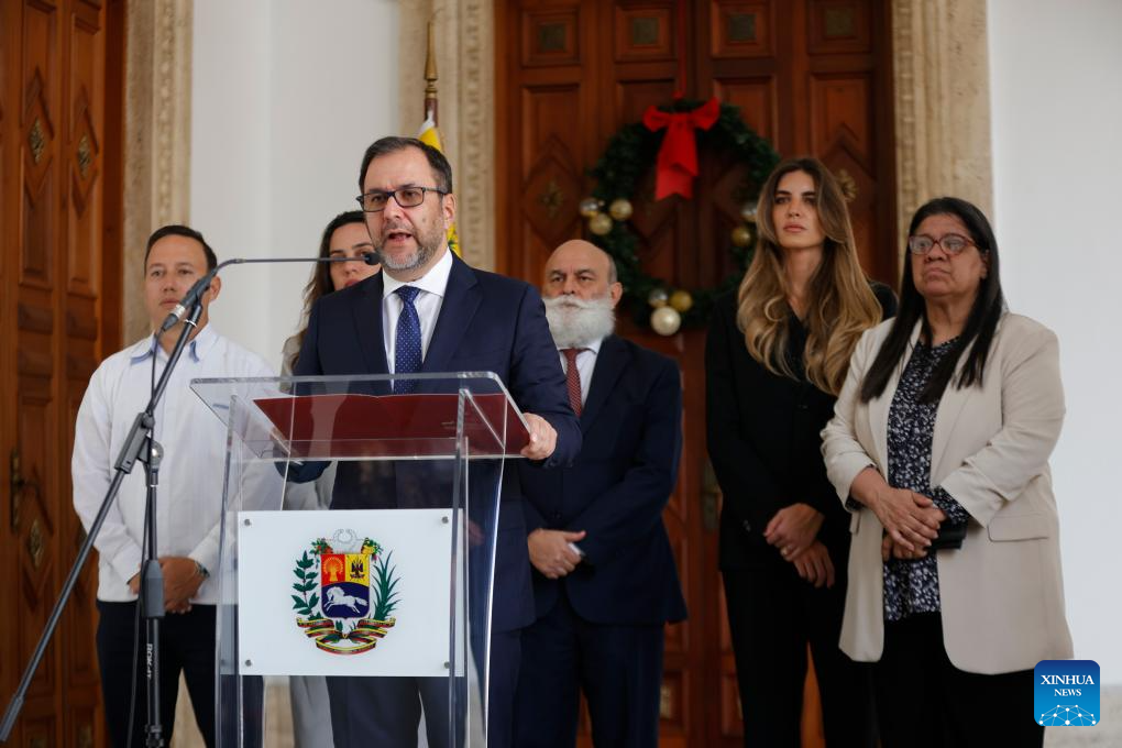 El canciller venezolano, Yván Gil (i-frente), habla durante una conferencia de prensa, en Caracas, Venezuela, el 22 de diciembre de 2025. El presidente venezolano, Nicolás Maduro, envió una carta a los jefes de estados latinoamericanos y a los miembros de la Organización de las Naciones Unidas, para alertar sobre las agresiones de Estados Unidos sobre Venezuela y que impactan en la región, informó el lunes el canciller de la nación sudamericana, Yván Gil. (Xinhua/Str)