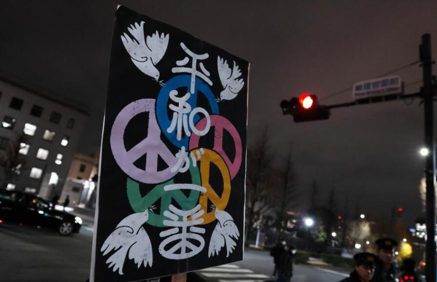 Los manifestantes corearon consignas como "Defendamos la constitución" y "No incitemos a la guerra".