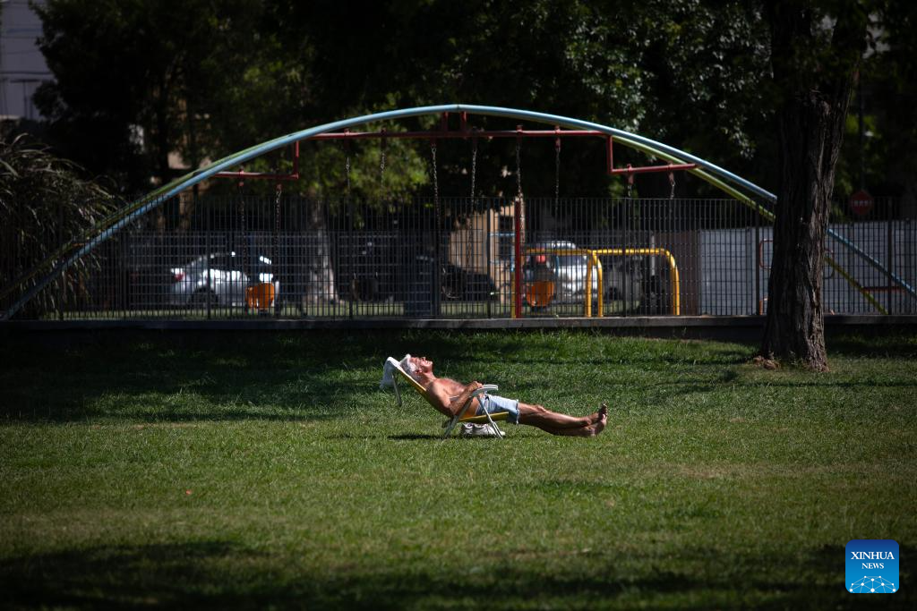 Un hombre descansa bajo el sol en un parque durante una ola de calor, en la ciudad de Buenos Aires, capital de Argentina, el 29 de diciembre de 2025. (Xinhua/Martín Zabala)
