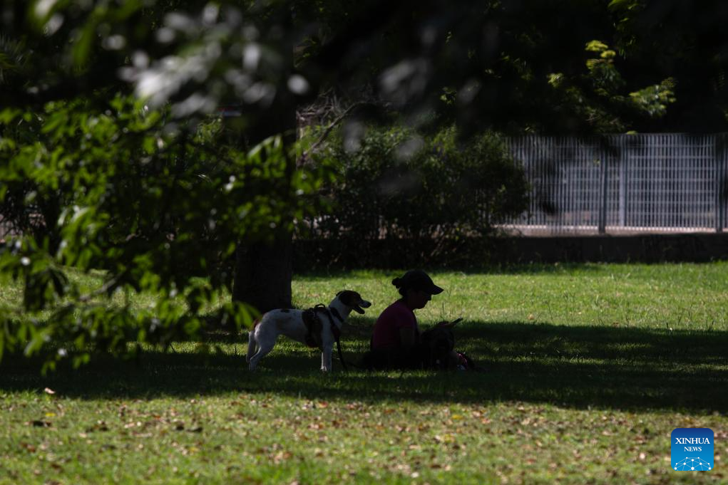 Una mujer y su perro descansan en un parque durante una ola de calor, en la ciudad de Buenos Aires, capital de Argentina, el 29 de diciembre de 2025. (Xinhua/Martín Zabala)