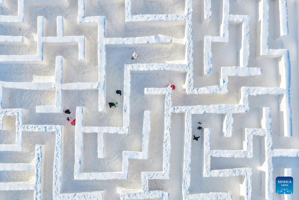 Vista aérea tomada con un dron el 2 de enero de 2026 de visitantes explorando un laberinto gigante hecho de hielo y nieve, en Tongjiang, en la provincia de Heilongjiang, en el noreste de China. La economía de China comenzó el 2026 con un fuerte impulso, como lo demuestra la intensa actividad económica de los primeros días del año. (Xinhua/Liu Wanping)