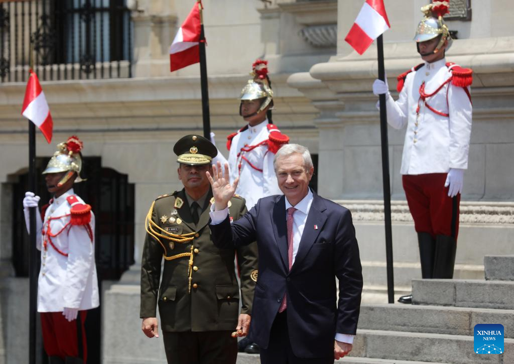 El presidente electo de Chile, José Antonio Kast (d-frente), saluda a su llegada al Palacio de Gobierno previo a una reunión con el presidente peruano, José Jerí, en Lima, Perú, el 7 de enero de 2026. Jerí recibió el miércoles al mandatario electo de Chile, José Antonio Kast, en el Palacio de Gobierno en Lima, en el inicio de una jornada de trabajo bilateral en la que discutieron un amplio abanico de temas, informó la sala de prensa de la Presidencia de la República del Perú. (Xinhua/Mariana Bazo)