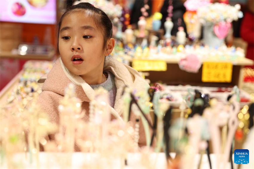 Una niña elige accesorios en una tienda del distrito de Qilihe de Lanzhou, provincia de Gansu, noroeste de China, el 6 de enero de 2026. (Xinhua/Chen Bin).