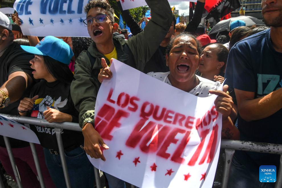 Imagen del 8 de enero de 2026 de personas gritando consignas mientras participan en una movilización para exigir la liberación del presidente venezolano, Nicolás Maduro y de la primera dama, Cilia Flores, capturados por Estados Unido, en Caracas, Venezuela. La presidenta encargada de Venezuela, Delcy Rodríguez, informó el jueves el inicio de una agenda de trabajo gubernamental centrada en la atención y recuperación de las zonas afectadas por el ataque de Estados Unidos del pasado 3 de enero. (Xinhua/Marcos Salgado)