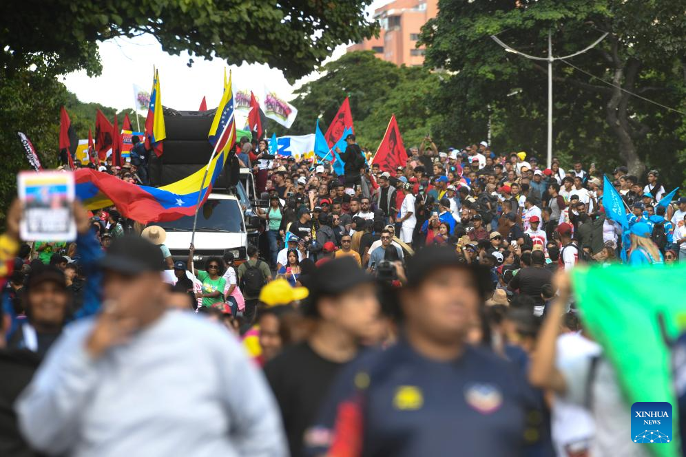 Imagen del 8 de enero de 2026 de personas participando en una movilización para exigir la liberación del presidente venezolano, Nicolás Maduro y de la primera dama, Cilia Flores, capturados por Estados Unido, en Caracas, Venezuela. La presidenta encargada de Venezuela, Delcy Rodríguez, informó el jueves el inicio de una agenda de trabajo gubernamental centrada en la atención y recuperación de las zonas afectadas por el ataque de Estados Unidos del pasado 3 de enero. (Xinhua/Marcos Salgado)