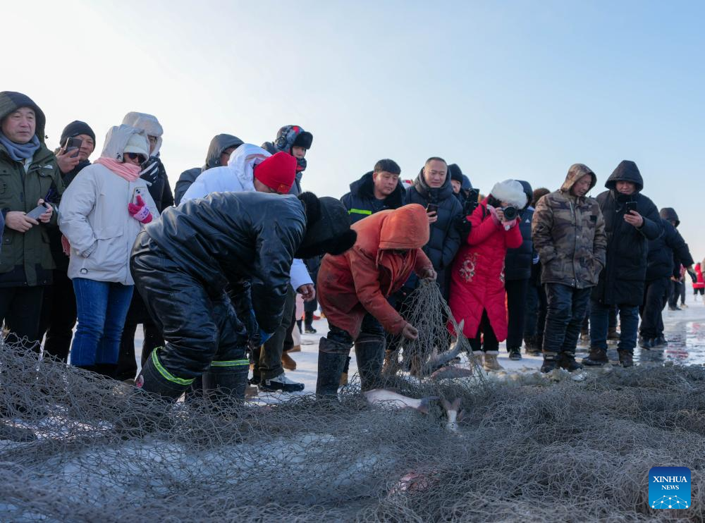 Imagen del 7 de enero de 2026 de visitantes observando la pesca en el hielo sobre el lago Chagan cubierto de hielo, en Songyuan, en la provincia de Jilin, en el noreste de China. El 24 Festival de Turismo Cultural de Pesca y Caza en Hielo y Nieve del Lago Chagan fue inaugurado aquí el jueves. Las técnicas de pesca tradicionales se realizan en el lago, como el cincelado manual del hielo, los cabrestantes tirados por caballos y el arrastre de redes bajo el lago cubierto de hielo. La pesca en el hielo del lago Chagan, un patrimonio cultural inmaterial nacional, se ha convertido en un símbolo significativo de la cultura del hielo y nieve en el noreste de China. (Xinhua/Yan Linyun)