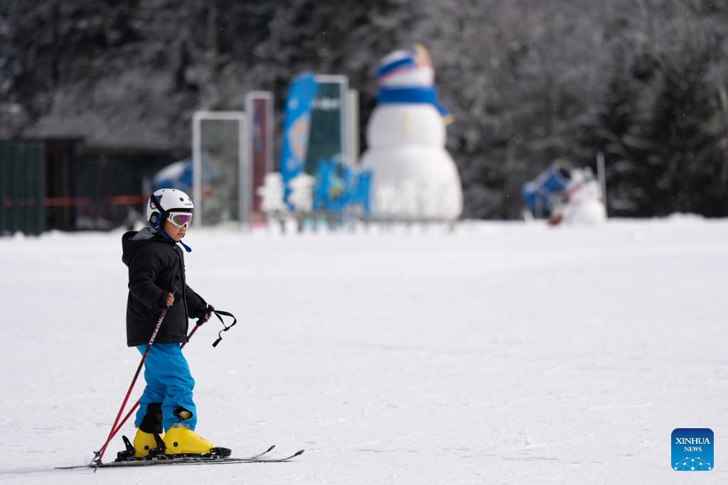 Un niño esquía en una estación de esquí en el distrito de Wenchuan, provincia de Sichuan, en el suroeste de China, el 6 de enero de 2026. (Xinhua/Xu Bingjie).