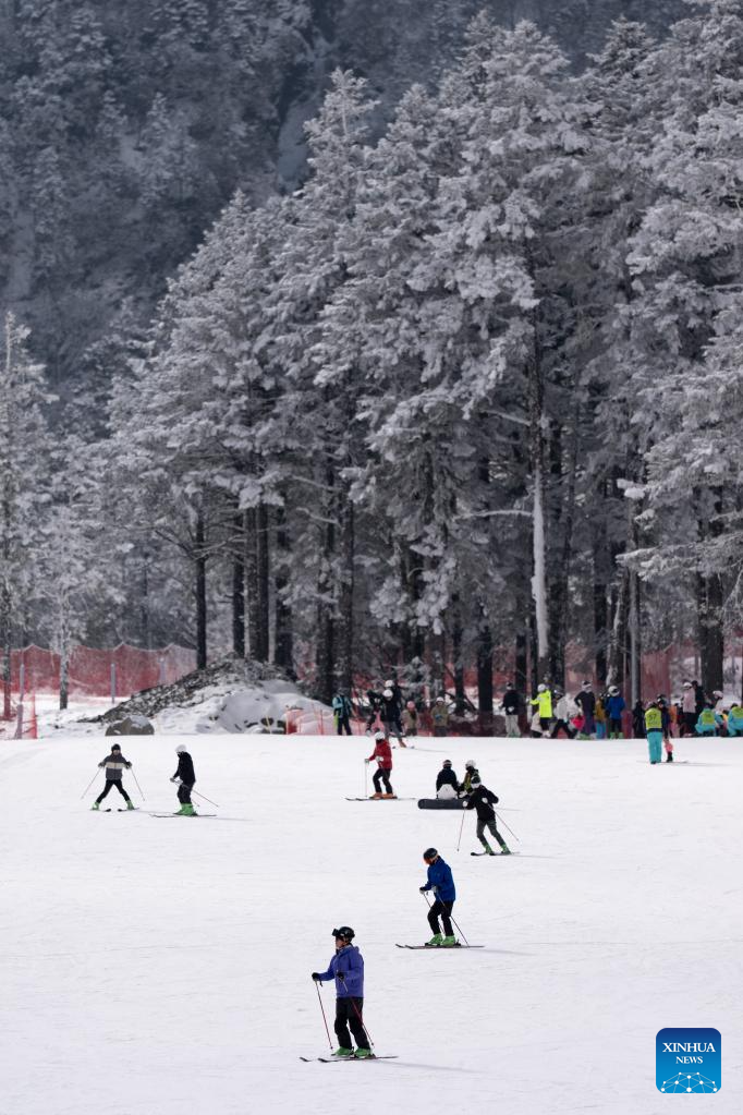 Gente esquiando en una estación de esquí en el distrito de Wenchuan, provincia de Sichuan, suroeste de China, el 6 de enero de 2026. (Xinhua/Xu Bingjie).