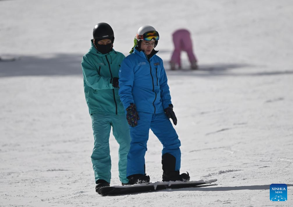 Un hombre aprende a esquiar siguiendo las instrucciones de un entrenador en una estación de esquí del distrito de Wenchuan, en la provincia de Sichuan, suroeste de China, el 6 de enero de 2026. (Xinhua/Liu Kun).