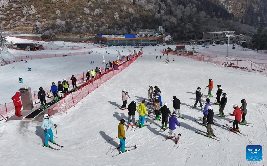 Una foto tomada con un dron muestra a personas divirtiéndose en una estación de esquí en el distrito de Wenchuan, provincia de Sichuan, suroeste de China, el 6 de enero de 2026. (Xinhua/Liu Kun).