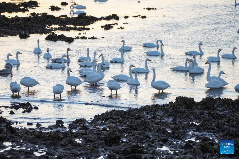 Más de 6000 cisnes cantores migran en masa a Rongcheng, este de China, para pasar el invierno