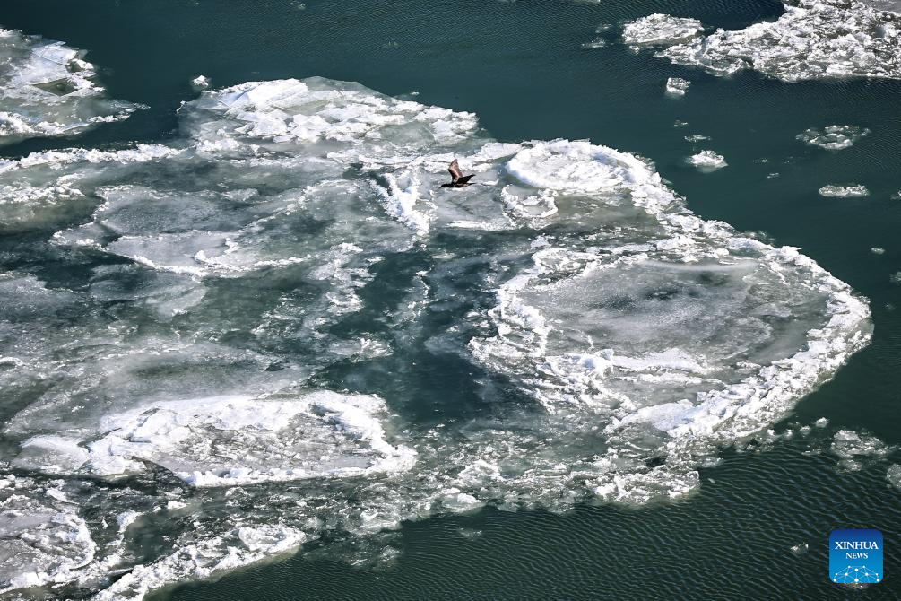 Un pájaro vuela sobre los témpanos de hielo que flotan sobre el río Danubio en Budapest, Hungría, el 12 de enero de 2026. (Foto de David Balogh/Xinhua).