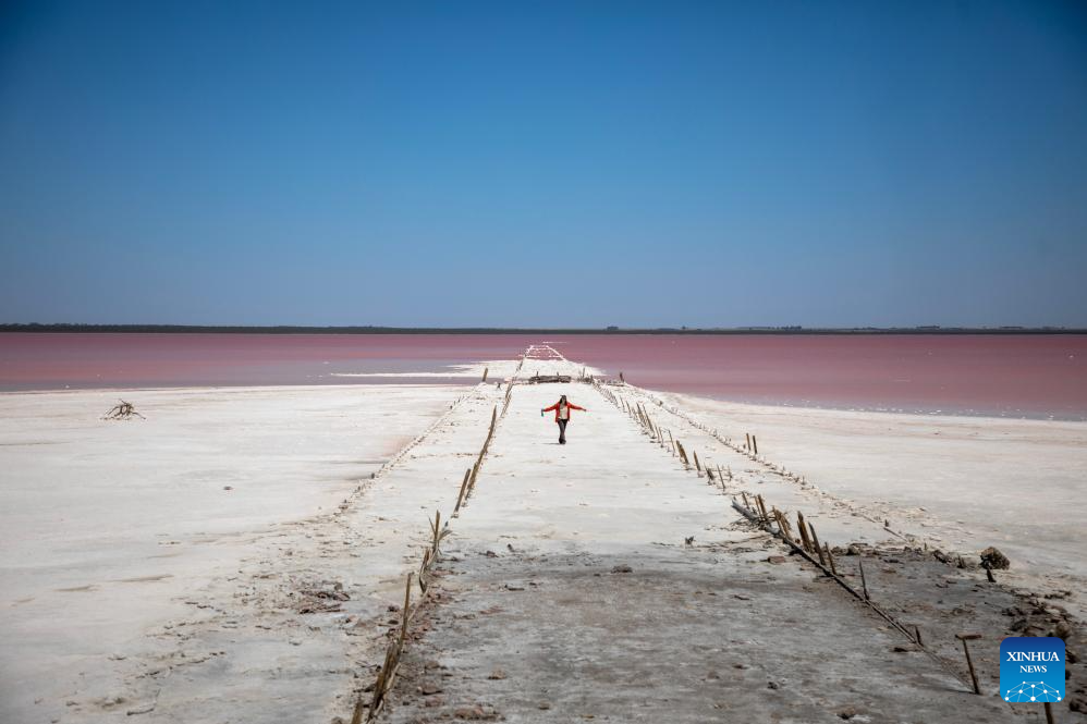 Imagen del 11 de enero de 2026 de una mujer recorriendo uno de los sectores de las Salinas Grandes de Hidalgo, en la localidad de Macachín, en la provincia de La Pampa, Argentina. (Xinhua/Martín Zabala)