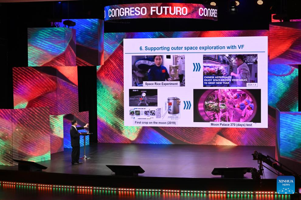 El científico agrícola chino, Yang Qichang, experto de la Academia China de Ciencias de la Agricultura, participa en una presentación durante el Congreso Futuro 2026, en Santiago, capital de Chile, el 13 de enero de 2026. La agricultura de ambiente controlado puede producir alimentos y resolver los desafíos del aumento de población y disminución de tierra arable, de la mano de la agricultura vertical, destacó el martes Yang Qichang durante su participación en el chileno Congreso Futuro 2026. (Xinhua/Jorge Villegas)