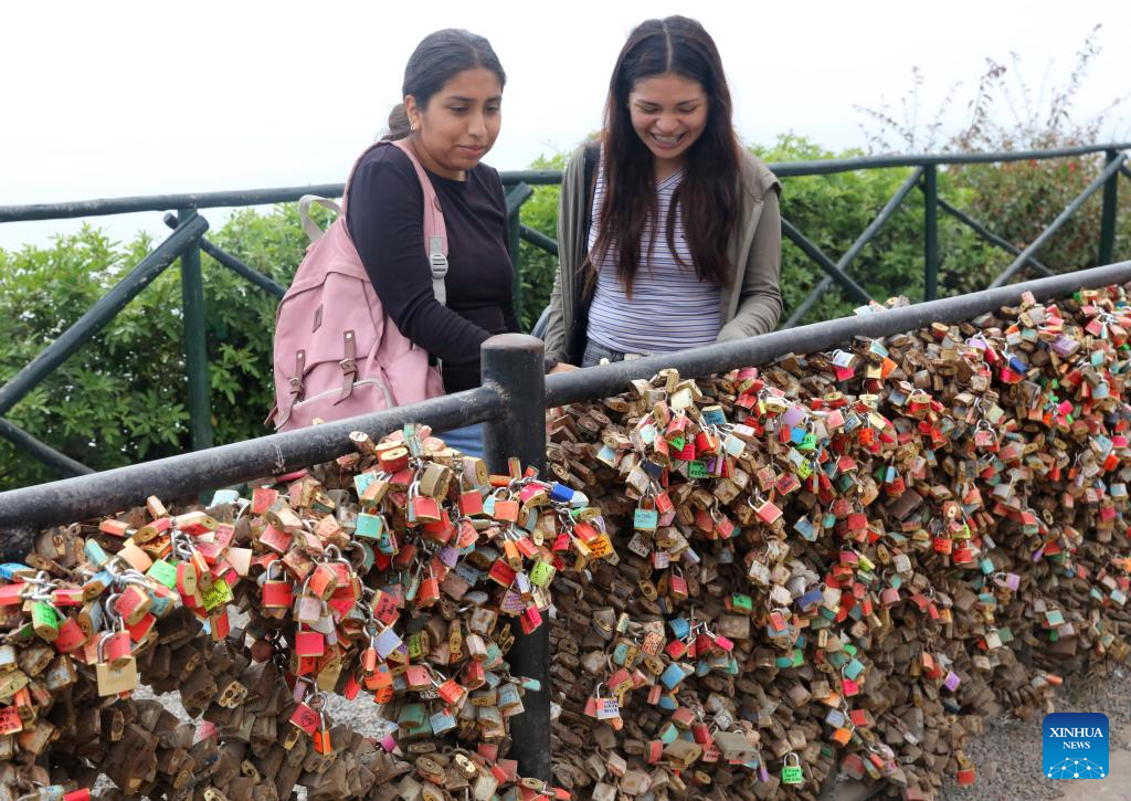 Turistas visitan la zona de cerrojos que dejan los visitantes en el Parque del Amor, en la zona turística del distrito de Miraflores, en Lima, Perú, el 15 de enero de 2026. Perú recibió 4.157.469 visitantes internacionales durante 2025, lo que representó un crecimiento de 4,1 por ciento respecto a 2024 y una recuperación del 78,8 por ciento frente a los niveles previos a la pandemia del coronavirus, informó el jueves el Ministerio de Comercio Exterior y Turismo. (Xinhua/Mariana Bazo)