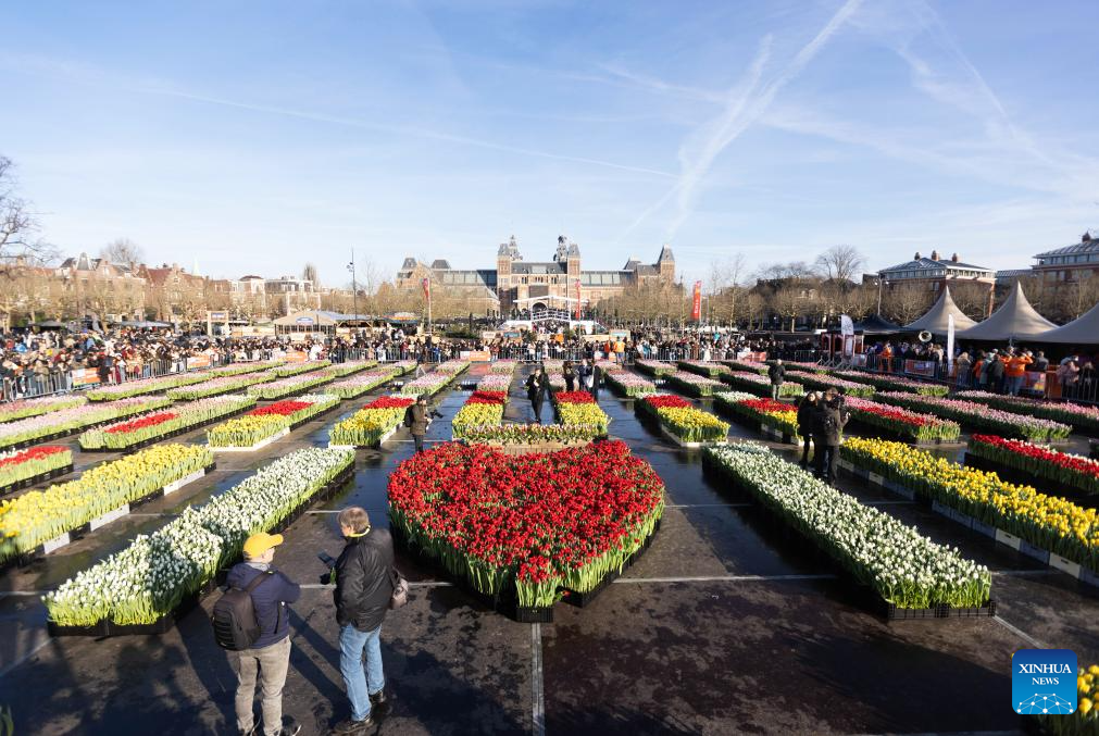 Imagen del 17 de enero de 2026 de un enorme jardín con más de 200.000 tulipanes en la Plaza de los Museos, en Amsterdam, Países Bajos. Los holandeses celebraron el Día Nacional del Tulipán, que tradicionalmente se celebra el tercer sábado del año. (Xinhua/Sylvia Lederer)