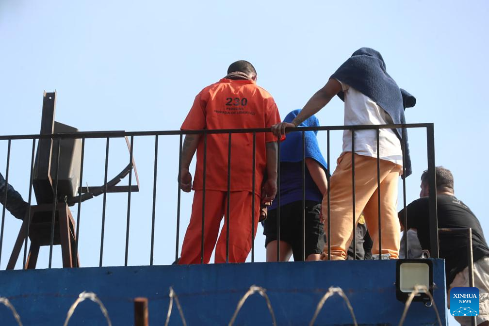 Imagen del 17 de enero de 2026 de personas privadas de la libertad vigilando durante un motín en el Centro de Detención para Hombres Fraijanes II, en el municipio de Fraijanes, Guatemala. En tres cárceles de Guatemala se registraron motines el sábado y al menos 46 personas fueron tomadas como rehenes, dijo el ministro de Gobernación, Marco Antonio Villeda. (Xinhua/Str)